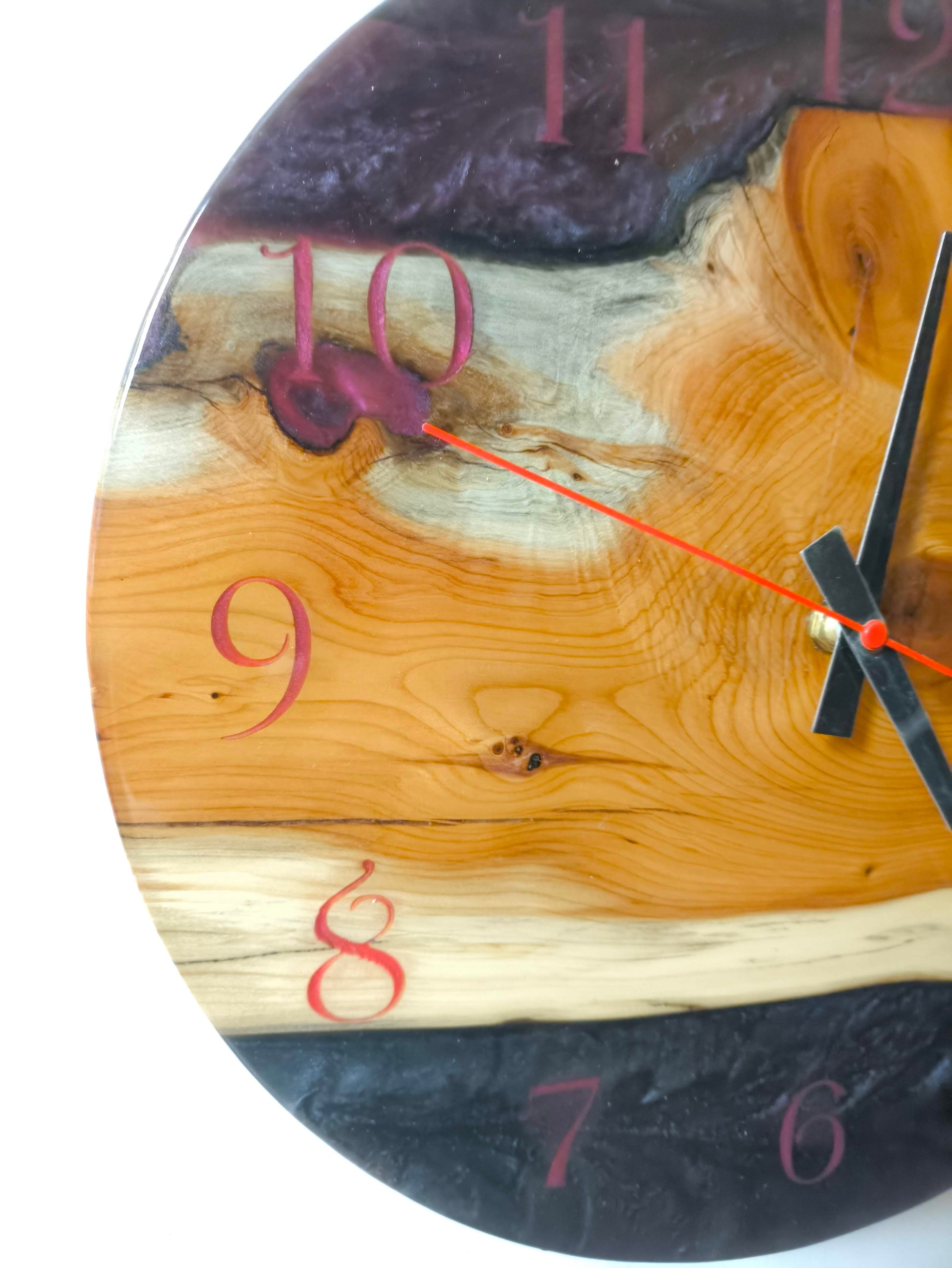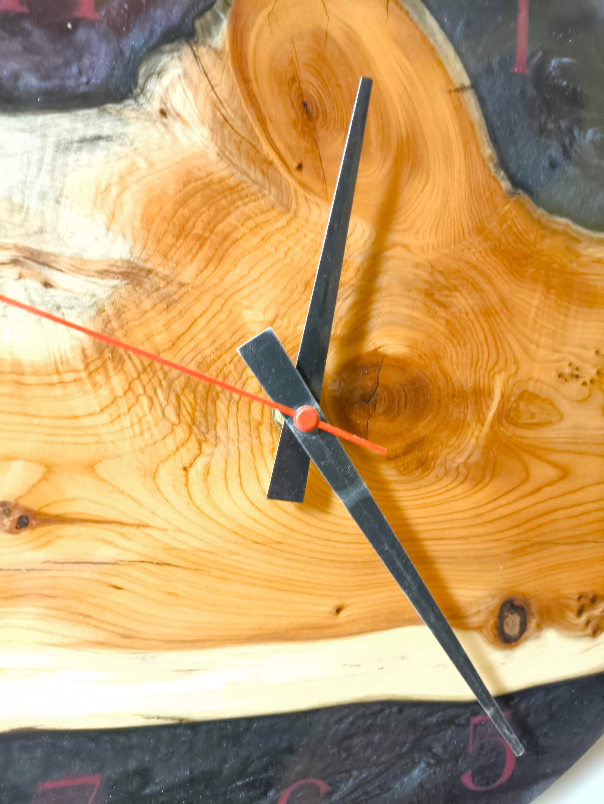 Découvrez cette magnifique horloge murale artisanale alliant la beauté naturelle du bois d'If et l'élégance moderne de la résine époxy.